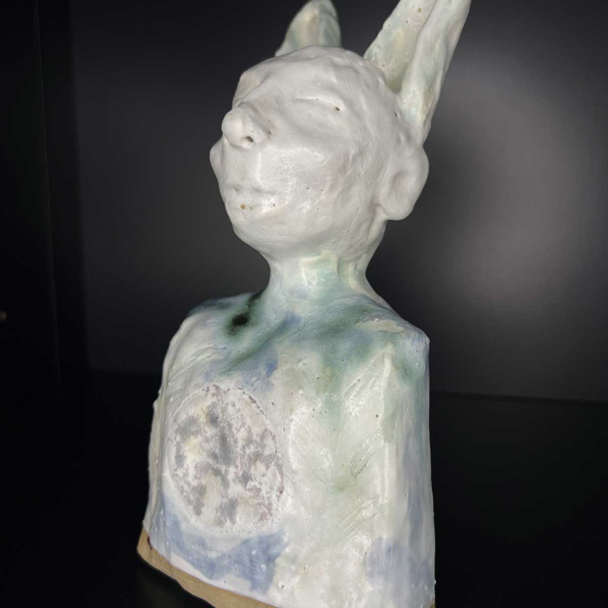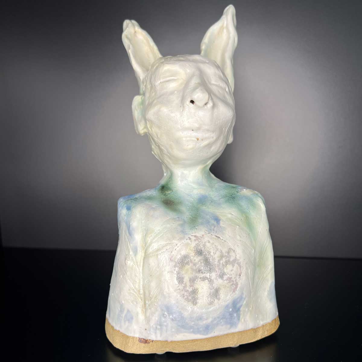 This ceramic hare/human bust sculpture is part of my Moon collection of forest folk. – Derived from my fascination with the moon, mythology and chimeric cryptids.