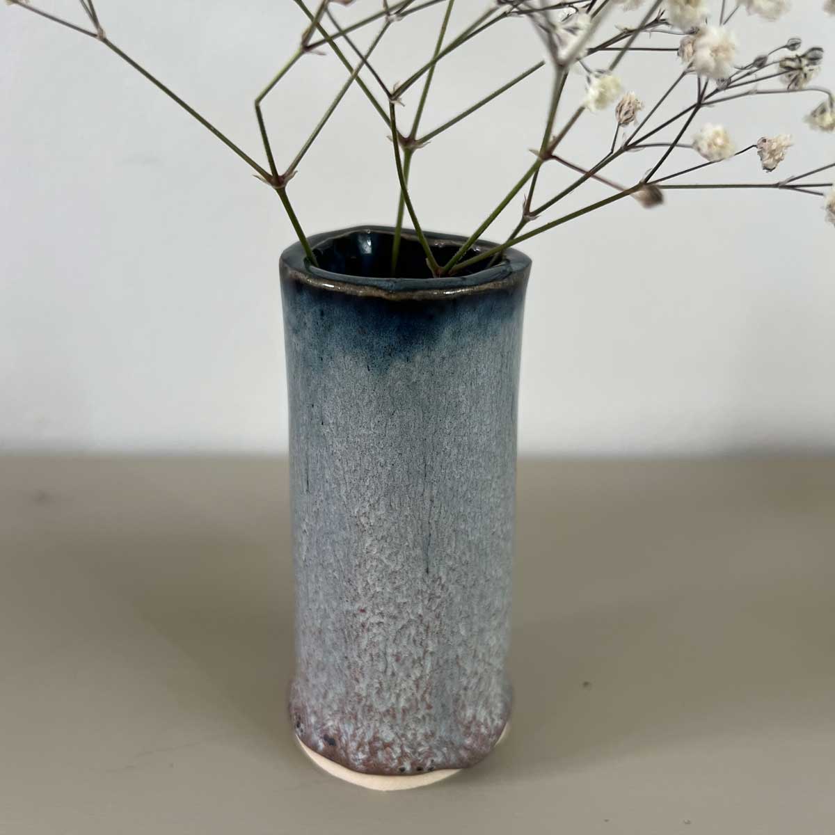 A lovely ceramic mini bud vase to hold a small posy. It would sit very nicely on a desk for a couple of little blooms.